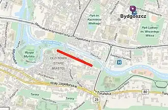 Grodzka Street is a historical street in Old Town of Bydgoszcz, Poland. The street is located in the northern part of the Old Town: it stretches along Brda River waterfront, following an east–west axis. The street starts at the intersection with Bernardyńska street and ends at Tadeusz Malczewski street's crossing. Its length is approximately 430 m. The Grodzka Street was laid out in mid-14th century, when Bydgoszcz became a charter city.[1] Grodzka Street buildings vary greatly one from the other, beginning with the three historic granaries from late 18th century, to the all-glass similar-shape modern mBank in Bydgoszcz, which became an icon of Polish architecture.