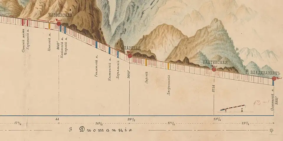 Gvileti (Гвилецкiй) and Kistin (Кистинскiй) bridges on a longitudinal profile map of the Georgian Military Road (late XIX century)