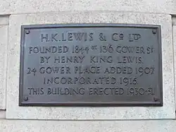 H. K. Lewis & Co. Ltd. was founded in 1844 by Henry King Lewis (born 10 February 1823 in Margate, died 30 January 1898 in Hastings)[1][2] at 15 Gower Street as a small bookselling and stationery business.[3] In the 1871 census he had expanded his business and become a publisher. The firm was incorporated in 1915.[2]