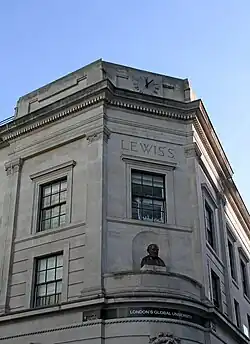 136 Gower Street was the best-known location, and housed sales and the reading library. The current Lewis Building was erected in 1930–31. The name "Lewis's" is carved at the top of the building, beneath a clock. It also displays a bronze bust of Hippocrates the "Father of Medicine" by William Aumonier Jr., based on a sculpture held at the British Museum, and presented by the chairman H.L. Jackson and his wife.[8][9] The building is now part of University College London.