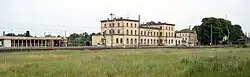 As a starting point of the first railway line towards Mecklenburg-Schwerin Hagenow Land station was equipped with the standard equipment for the maintenance and repair of railway rollingstock. These still exists, but in a highly dilapidated condition. There was a depot (Bahnbetriebswerk), which was located on the south side of the line towards Ludwigslust. It had among other things, a roundhouse with ten stalls and a turntable. Another very similar building nearby suggests a second roundhouse, but all traces of a turntable and sidings that probably once existed have disappeared. There are other sidings and a shed on the property. A former water tower, which is about 30 m-high, is located near the station building. This eleven-storey high, Brick Expressionist construction was built in 1926.[8] It is in a highly dilapidated condition and is a heritage-listed building.[9]