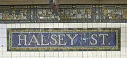 Both platforms have their original mosaic tile band that is colored blue and green with yellowish accents.[18] "H" tablets on blue background run along the tile bands at regular intervals.[18] The name tablets read "HALSEY ST." in gold serif font on a blue background and a green, yellow, and blue border.[18] There are also directional signs in gold serif font and outline on a blue background.[18] One of the platforms formerly had two bathrooms. Yellow i-beam columns run along both platforms at regular intervals with alternating ones having the standard black station name plate in white lettering.[18]