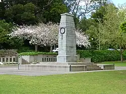 Hamilton's first militia settlers landed on this site in 1864. The park and cenotaph were created in memory of First World War soldiers on what was previously called Kowhai Bank.[35] The park was further developed with a Second World War memorial as well as a Spitfire air-force memorial.[19] On 11 November 2017, a life-size[36] bronze memorial of a war horse was officially unveiled, as a commemoration of the various war horses that fought for New Zealand during the First World War,[37] as well as to commemorate 99 years since the end of the First World War.[38][39][40]