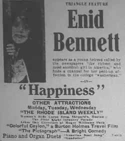Happiness is a 1917 comedy drama feature film written by C. Gardner Sullivan and starring Enid Bennett and Charles Gunn. A rich orphan and heiress played by Bennett is described in the newspapers as "the richest and most snobbish girl in America."[1] She goes to a co-ed college where she is snubbed by students who view her as a snob. A romance develops with a poor student (played by Charles Gunn) who is taking in washing to pay his way through college. A print exists in the Library of Congress collection.[2][3]