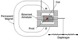 One of the earliest companies to make headphones for wireless operators was the Holtzer-Cabot Company in 1909.[20] They were also makers of head receivers for telephone operators and normal telephone receivers for the home.[20] Another early manufacturer of headphones was Nathaniel Baldwin.[21] He was the first major supplier of headsets to the U.S. Navy.[22] In 1910, motivated by his inability to hear sermons during Sunday service, he invented a prototype telephone headset.[23] He offered it for testing to the navy, which promptly ordered 100 of them. Wireless Specialty Apparatus Co., in partnership with Baldwin Radio Company, set up a manufacturing facility in Utah to fulfill orders.[24] These early headphones used moving iron drivers,[25] with either single-ended or balanced armatures. The common single-ended type used voice coils wound around the poles of a permanent magnet, which were positioned close to a flexible steel diaphragm. The audio current through the coils varied the magnetic field of the magnet, exerting a varying force on the diaphragm, causing it to vibrate, creating sound waves. The requirement for high sensitivity meant that no damping was used, so the frequency response of the diaphragm had large peaks due to resonance, resulting in poor sound quality. These early models lacked padding, and were often uncomfortable to wear for long periods. Their impedance varied; headphones used in telegraph and telephone work had an impedance of 75 ohms. Those used with early wireless radio had more turns of finer wire to increase sensitivity. Impedances of 1,000 to 2,000 ohms was common, which suited both crystal sets and triode receivers. Some very sensitive headphones, such as those manufactured by Brandes around 1919, were commonly used for early radio work.