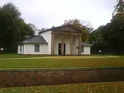 Commissioned in 1807 by Sir Thomas Egerton, the Grand Lodge was designed by Lewis Wyatt as an impressive main entrance to the park from the south. The lodge is built of ashlar sandstone as a large triumphal arch and originally led onto one of the longest carriage drives to the house. It has two floors of accommodation, cellars under the west wing and an attic over the arch. The construction of the lodge completed the enclosure of the park by a 10-foot (3.0 m) high boundary wall.[30] It was refurbished as part of the millennium project and is now rented out to the public as short stay accommodation. There is a memorial plaque here dedicated to the memory of the Manchester Pals who trained in the park in 1914.