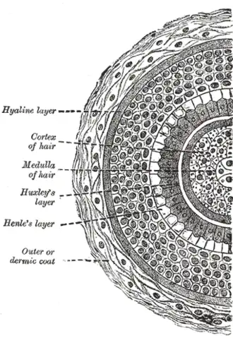 Henle's layer is the third and the outermost layer of the inner root sheath of the hair follicle, consisting of a single layer of cubical cells with clear flattened nuclei. It is named after German physician, pathologist and anatomist Friedrich Gustav Jakob Henle.[1]