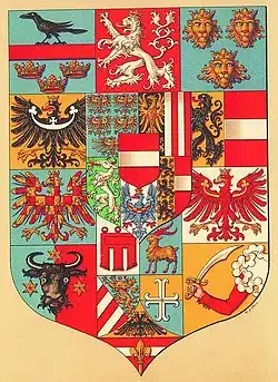 Middle Coat of arms of the Austrian part of the Empire in 1915. It shows as a center shield (inescutcheon) the personal arms of Habsburg-Lorraine over the arms of dominions of the Habsburg lands. It usually had the personal arms of Habsburg-Lorraine in the center.