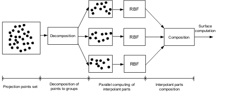 In this case, hierarchical division of space contains points on elementary parts, and the system of small dimension solves for each. The calculation of surface in this case is taken to the hierarchical (on the basis of tree-structure) calculation of interpolant. A method for a 2D case is offered by Pouderoux J. et al.[3] For a 3D case, a method is used in the tasks of 3D graphics by W. Qiang et al.[4] and modified by Babkov V.[5]