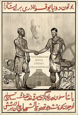 The Russian Empire comprised a multitude of nationalities, languages, ethnic groups and religions. The spirit of nationalism, so strong in 19th century Europe, was significant in Russia, Ukraine, and Finland especially before 1900. Much later the spirit of nationalism appeared in central Asia, especially among the Muslim population.[37] The Bolsheviks made use of the slogan "Self-determination" to fight imperialism and to build support among non-Russian nationalities.[38] Lenin's position was that after the revolution all nationalities would be free to choose, either to become part of Soviet Russia or become independent.[39] Left-wing Bolsheviks, most notably Georgy Pyatakov, derided nationalism as a false consciousness that was much less important than class conflict, and would disappear with the victory of socialism.