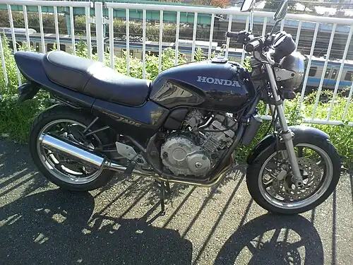 The Honda Jade also known as the Honda Jade 250, or Honda CB250F Jade is a standard motorcycle which was launched by Honda in March 1991 with its internal type designation 'MC23'. It was available in Japan as a domestic model from 1991 to 1996. Powered by a de-tuned version of the inline-four 249 cc engine from the CBR250RR (1990-1995), with 11.5:1 compression ratio, it produces 40 PS at 14,000 rpm with redline of 16,000 rpm. The bike features a 6-speed transmission, 14-litre fuel tank, and a center stand.[1]
