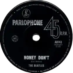 "Honey Don't" is a song written by Carl Perkins, originally released on January 1, 1956[2] as the B-side of the "Blue Suede Shoes"[1] single, Sun 234. Both songs became rockabilly classics. Bill Dahl of Allmusic praised the song saying, "'Honey Don't' actually outclasses its more celebrated platter-mate in some ways."[3] It has been covered by more than 20 other artists, including the Beatles, Ronnie Hawkins and Johnny Rivers.[4] The song has appeared in films such as The Prince of Tides, Diner, and Perfect Sisters.