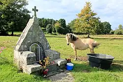 The theme of water is sometimes mixed with fantasy. In Boqueho, legend has it that in the moonlight, horses come to drink from the stream near the Kergoff menhir, making a lot of noise, but without anyone being able to see them. In one tale, the horses turn into a fountain just as a magician's daughter flees with her lover. In Plouguenast, a "drowning horse" stretches out his back to take four or five children and throw them into a pond. There are also tales of drowned horses, notably in the legend of Saint Rou, who fell into a fountain in the forest of Rennes. The horse's neighs of distress can still be heard.[85]