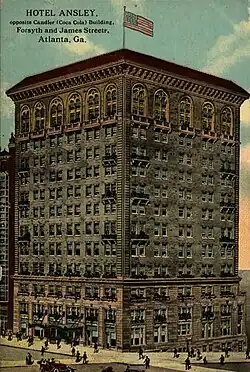 The Hotel Ansley was a hotel that occupied the south side of Williams Street between Forsyth and Fairlie streets in the Fairlie-Poplar district of Downtown Atlanta. It was built in 1913 by Jerome B. Pound, publisher of the Chattanooga News in Chattanooga, Tennessee,[1] and named for Edwin P. Ansley, developer of the Ansley Park neighborhood; an estimated 5000 guests attended the opening of the $1,000,000 property. The property was originally managed by M.I. and Frank Harrell.[2]