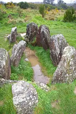 Hotié, Hostié or Maison de Viviane (English: House of Viviane), also known as Tombeau des Druides (English: Druids' Tomb)[2][3] is a megalithic tomb in Paimpont, Ille-et-Vilaine, in Brittany. The Hotié de Viviane is one of the prehistoric monuments in the Forest of Brocéliande cursorily described in the 19th century, but more recently, following the fires that have periodically devastated the forest, rediscovered and excavated by local groups.[4] Legend makes it the home of the fairy Viviane, where she held the enchanter Merlin imprisoned. Another legend equates it with the esplumoir Merlin.[5] When the location of the Val sans retour, a place figuring in medieval Arthurian literature, was identified with the Val de Rauco in the 19th century, the megalithic site near the Gurvant valley took the name of Hotié de Viviane. Hotié de Viviane is also sometimes identified as Tombeau de Viviane (English: Tomb of Viviane).[6][7]