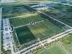 Throughout 2008, the City of Houston purchased several adjoining tracts of land adjacent to the Houston Community College South Campus and parallel to the South Freeway at Airport Boulevard, and re-platted it as "Houston Amateur Sports Park" the following year. On June 25, 2008, the City of Houston and the Houston Dynamo officially announced plans for a 100-acre, 18-field park to the public.[9] The following day, a public event where Mayor Bill White and other city officials were in attendance, was held at the nearby Houston Community College South Campus.[10] On December 16, 2009, the city awarded a US$4.2 million contract to South Coast Construction, Inc. to build a new portion of Kirby Drive from Airport Boulevard to nearby Sims Bayou throughout the park.[11]