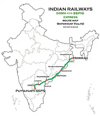 The 22831 / 32 Howrah Junction–Sathya Sai Prasanthi Nilayam Express ran from Howrah Junction via Kharagpur Junction, Khurda Road Junction, Duvvada, Vijayawada Junction, Guntur Junction, Gooty Junction to Sri Sathya Sai Prasanthi Nilayam.