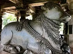 The Hoysaleswara temple is a twin-temple dedicated to Hoysaleswara and Santaleswara Shiva lingas, named after the masculine and feminine aspects, both equal and joined at their transept. It has two Nandi shrines outside, where each seated Nandi face the respective Shiva linga inside.[11] The temple includes a smaller sanctum for the Hindu Sun god Surya. It once had superstructure towers, but no longer and the temple looks flat.[12] The temple faces east, though the monument is presently visited from the north side. Both the main temples and the Nandi shrines are based on a square plan.[13] The temple was carved from soapstone.