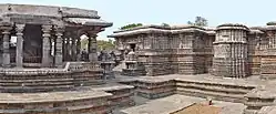 The temple had towers on top of each sanctum, but they are now missing. According to Foekema, these towers must have followed the star shape of the shrine, because Hoyasala temples that are better preserved have them.[31] The superstructure over the vestibule which connects the shrine to the mantapa, called sukanasi (a low tower that looks like an extension of the main tower) is also missing. Similar the row of decorated miniature roofs, the eastern perimeter walls and other shrines with the main temple are all gone.[32]