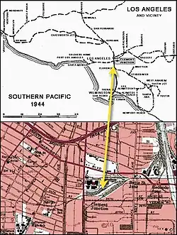 Another threat was the tempting sea-level route that the Rindge ranch offered for the construction of a railroad from Los Angeles northward to San Francisco. A water-level route would have saved the Southern Pacific from having to use helper engines to shove its trains up the stiff grades of its inland routes through Saugus and the Santa Susana Pass.[15][16]