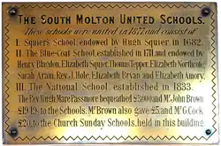 In 1877 it was amalgamated with the Blue Coat School, founded in 1711, and with the National School, founded in 1833. The combined school was known as South Molton United Schools.[21] A 19th century memorial brass tablet situated above the fireplace in the school-hall of South Molton Primary School, North Street, is inscribed as follows: