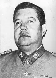 The worst violence occurred in the first three months of the coup's aftermath, with the number of suspected leftists killed or "disappeared" (desaparecidos) soon reaching into the thousands.[6] In the days immediately following the coup, the Assistant Secretary of State for Inter-American Affairs informed Henry Kissinger that the National Stadium was being used to hold 5,000 prisoners, and as late as 1975, the CIA was still reporting that up to 3,811 prisoners were still being held in the Stadium.[7] Amnesty International reported that as many as 7,000 political prisoners in the National Stadium had been counted on 22 September 1973.[8] Nevertheless, it is often quoted in the press, that some 40,000 prisoners were detained in the Stadium.[9] Some of the most famous cases of "desaparecidos" are Charles Horman, a U.S. citizen who was killed during the coup itself,[10][11] Chilean songwriter Víctor Jara, and the October 1973 Caravan of Death (Caravana de la Muerte) where at least 70 persons were killed.[12] Other operations include Operation Colombo during which hundreds of left-wing activists were murdered and Operation Condor, carried out with the security services of other Latin American dictatorships.