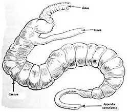Some herbivorous animals, such as rabbits, have a terminal vermiform appendix and cecum that apparently bear patches of tissue with immune functions and that may also be important in maintaining the composition of intestinal flora. It does not seem to have much digestive function, if any, and is not present in all herbivores, even those with large caeca.[13] As shown in the accompanying pictures, the human appendix typically is about comparable to that of the rabbit's in size, though the caecum is reduced to a single bulge where the ileum empties into the colon.[7] Some carnivorous animals have appendices too, but few have more than vestigial caeca.[14] In line with the possibility that vestigial organs develop new functions, some research suggests that the appendix may guard against the loss of symbiotic bacteria that aid in digestion, though that is unlikely to be a novel function, given the presence of vermiform appendices in many herbivores.[15][16] Intestinal bacterial populations entrenched in the appendix may support quick reestablishment of the flora of the large intestine after an illness, poisoning, or after an antibiotic treatment depletes or otherwise causes harmful changes to the bacterial population of the colon.[17]