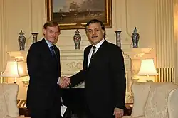 United States Deputy Secretary of State Robert Zoellick hosting meeting with Humayun Akhtar Khan, Pakistan's Minister of Commerce, on 28 November 2005
