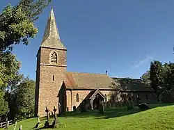 Within the parish are two Grade II* and twelve Grade II listed buildings and structures, and three scheduled monuments, including the Church of St Mary, dating to 1200, the 17th-century Humber Court, and the 18th-century Risbury Mill.[13][14][15][16] At 220 yards (200 m) south-east from the church is the site of a Deserted medieval village (at 52°12′07″N 2°40′43″W / 52.20196°N 2.678644°W / 52.20196; -2.678644), and just to the south from the A44 road is the site of Steens Bridge railway station (at 52°12′41″N 2°40′12″W / 52.211507°N 2.66989°W / 52.211507; -2.66989), closed 1964, which was on the Leominster Junction to Worcester line of the Leominster and Worcester Branch Railway.[17] Risbury Camp, at 700 yards (640 m) north-west from Risbury, is the site of an Iron Age hill fort.[18][19]