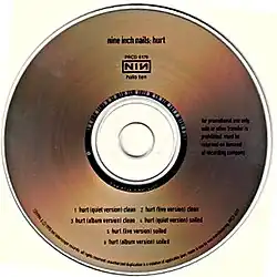 8. ^ "Hurt" (US promotional CD single). Nine Inch Nails. Interscope Records. 1995. PRCD 6179.{{cite AV media notes}}: CS1 maint: others in cite AV media (notes) (link)