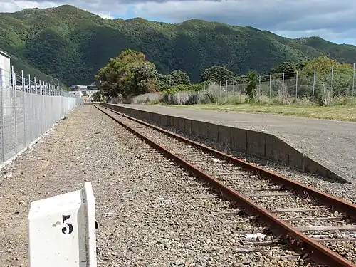 Hutt Park railway station, looking south. The platform now borders private land and the Hutt Valley Golf Course on the mothballed section of the Gracefield Branch line past the Hutt Workshops.