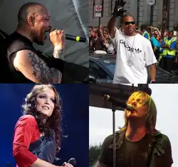 The album features four guest vocalists, each one contributing a different musical style in order to create the varied musical experience proposed by the band. Pictured: Jones, Xzibit, Turunen and Pirner.