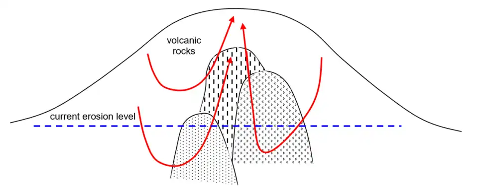 Finally, volcanic activity ceased and erosion removed the upper portions of the volcano and exposed the intrusive rocks and stockwork mineralization that used to lie within.[17]