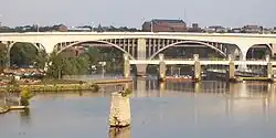 The I-35W Saint Anthony Falls Bridge crosses the Mississippi River one-half mile (875 m) downstream from the Saint Anthony Falls in Minneapolis, Minnesota in the U.S., carrying north–south traffic on Interstate 35W. The ten-lane bridge replaced the I-35W Mississippi River bridge, which collapsed on August 1, 2007. It was planned and is maintained by the Minnesota Department of Transportation (MnDOT). The planning, design, and construction processes were completed more quickly than normal because Interstate 35W is a critical artery for commuters and truck freight.[1] The bridge opened September 18, 2008, well ahead of the original goal of December 24.[6]