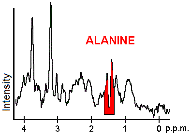 Each biochemical, or metabolite, has a different peak in the spectrum which appears at a known frequency. The peaks corresponding to the amino acid alanine, are highlighted in red (at 1.4 ppm). This is an example of the kind of biochemical information which can help doctors to make their diagnosis. Other metabolites of note are choline (3.2 ppm) and creatine (3.0 ppm).
