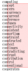 Brzozowski derivative (on red background) of a dictionary string set with respect to "con"