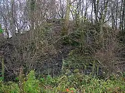 Ladyha No 2 pit was sunk in 1885 to a depth of 568 feet (173 m) and closed in May 1934, having struggled since its main customer, the Eglinton Iron Company, closed in 1928. A fairly substantial brick-lined tunnel still survives which once carried a standard gauge railway line unobtrusively to Ladyha colliery, out of the Earl's sight and the smoke kept away from the kitchen gardens' greenhouses and plants.[38] Other such cosmetic tunnels exist at Alloway and near Culzean Castle.[39] The tunnel was used during World War II as a bomb shelter and storage area for furniture; it remains in good condition. The old colliery ruins were razed to the ground in 2011, having been assessed as a danger to the public.