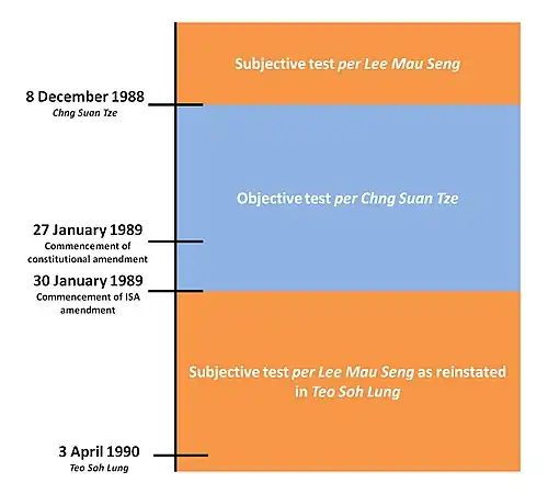 The Court of Appeal also held that legal precedents from other Commonwealth jurisdictions supported a rejection of the subjective test in favour of the objective test. The subjective test was applied in Liversidge v. Anderson (1941)[71] and subsequently affirmed in Greene v. Secretary of State for Home Affairs (1941).[72] However, these decisions had been departed from in subsequent decisions by the Privy Council and House of Lords. These courts had rejected the subjective test applied by the majority in Liversidge, preferring the objective test applied by Lord Atkin in his dissenting judgment. In the light of these developments, the Malaysian case of Karam Singh v. Menteri Hal Ehwal Dalam Negeri (Minister for Home Affairs), Malaysia (1969),[73] which had applied the test in Liversidge and which the respondents' counsel had relied on in support of the subjective test, could no longer be considered good law. Additionally, Teh Cheng Poh v. Public Prosecutor (1978)[74] decided by the Privy Council on appeal from Malaysia, was referred to by the Court in support of the objective test. The case concerned the exercise of discretionary power under the Malaysian Internal Security Act, which the ISA of Singapore is derived from.[75]