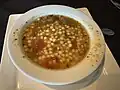 (or "pasta fazool" in Italian-American slang, from southern Italian fasule (lit. 'beans') instead of standard Italian fagioli) pasta with beans, often cannellini beans, that has the consistency of a stew |
