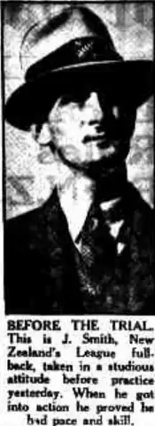 In comments on the New Zealand players the Sydney Morning Herald noted that Smith “is a very fine place kick” and mentioned his relationship with George Smith.[72] The Sun (Sydney) newspaper stated that Smith “will most likely play in the big games [and] should show Australians some brilliant goal kicking”.[73] He was also “fully expected to make good” on the tour in a piece by an Auckland correspondent that appeared in The Telegraph (Brisbane).[74] The Courier-Mail in an article by Pat Frawley noted that Smith was “the lightest man” in the New Zealand squad weighing 10 stone. Though he in fact weighed 10 stone 9 pounds and halfback Wilfred Brimble weighed just 10 stone 3 pounds.[75] While The Labor Daily (Sydney) said that Smith had “advanced steadily this season, as the result of tuition from ex-South Sydney back, Bobby Banham”.[76] An Auckland correspondent in a Sydney Morning Herald article said that Smith “was originally a centre-threequarter, but is ideally suited to the position of custodian”.[77] The Sun said “the find of the season is Jack Smith, who is playing only his second year [of seniors] in the game. He started last year as a five eighth, and is now a full-back. In three matches he kicked 25 goals”.[78]