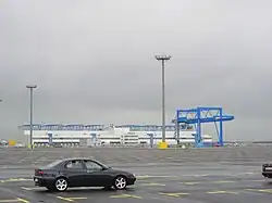 JadeWeserPort (German pronunciation: [jaːdə veːzɐ pɔɐ̯t]) is Germany's largest harbour project. It is supported by the states of Lower Saxony (50.1% stake) and Bremen (49.9% stake).[2] This new container port is located at Wilhelmshaven at the Jade Bight, a bay on the North Sea coast. It has a natural water depth in excess of 18 m. Container ships with a length of 430 metres (1,410 ft) and 16.5 metres (54 ft) draught are able to call the JadeWeserPort at any tide. Construction work was begun in March 2008. The port was opened on 21 September 2012.[3] However, due to the Great Recession, the port wasn't given the warmest of welcomes, and very little TEU traffic flowed through the brand new harbour.[4] But the container handling could be raised from 60,000 in 2014 to 712.953 twenty-foot equivalent unit in 2021.[5] The yearly capacity of the port is 2,700,000 TEU.[6][7][8][9][10][11]