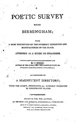 Bisset was a notable figure in Birmingham's cultural and commercial life, a prominent member of the Birmingham Book Club and a composer of much published verse.[2] His most notable work is his 1800 Poetic survey round Birmingham, with a brief description of the different curiosities and manufactures of the place, accompanied with a magnificent directory, with the names and professions, &c. superbly engraved in emblematic plates – a directory of Birmingham trades at the time of the town's revolutionary industrial expansion, written in heroic verse and intended as a "grand tour" of the "works of genius" of a "seat of the arts".[1][6]