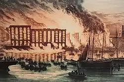 On 22 June 1861 Braidwood died in the Tooley Street fire at Cotton's Wharf near London Bridge station when a falling wall crushed him, three hours after the fire began.[8] It took two days to recover his body. His heroism led to a massive funeral on 29 June in which the funeral cortege stretched 1.5 miles (2.4 km) behind the hearse, a public spectacle almost equal to the fire itself.[9] The fire, which continued to burn for a fortnight, caused damage valued at £2,000,000, equivalent to £235,740,000 in 2023 and was considered the worst fire since the Great Fire of London in 1666.[10]