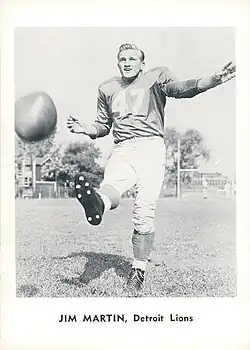 James Richard "Jungle Jim" Martin (April 8, 1924 – October 9, 2002) was an American professional football player who was a guard, linebacker and placekicker for 14 seasons in the National Football League (NFL) in the 1950s and 1960s, primarily with the Detroit Lions. He was selected to the Pro Bowl, the NFL's all-star game, after the 1961 season, and went on to be an assistant coach after his playing career. He was an All-American playing college football for the Notre Dame Fighting Irish and was inducted into the College Football Hall of Fame in 1995.
