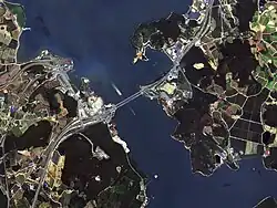 A twin bridge, consisting of two cable-stayed bridges of very similar design, connect Jindo Island with the mainland, and its shape is reflected in the logo of the Jindo County. The first Jindo Bridge was opened on 18 October 1984.[8] It has the main span of 344 m and two side spans of 70 m making the total length of 484 m at a width of only 11.7 m. At the time of its opening, it was the world's longest and narrowest suspension bridge. A 200-meter part under the bridge is open for major navigation for ships with ceiling below 20 meters.[9] The increase in local traffic meant the government needed to add the second bridge in 2005, which is of the same length, but wider at 12.5 meters.[10]