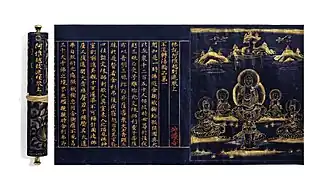 The Jingo-ji Tripiṭaka is a Japanese collection of the Tripiṭaka (Chinese Buddhist canon) composed of over 5400 scrolls made of Indigo dyed paper, and written in golden ink. Created in the twilight of the Heian period, throughout the Genpei War, the compilation of the canon was commissioned by Emperor Toba and Emperor Go-Shirakawa from 1150-1185. The scrolls were then deposited in Jingo-ji, Ukyō-ku, Kyoto. In the years since, 2317 scrolls remained with the temple while many others have been scattered into private collections and museums around the world.[1][2][3]