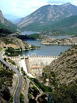 In the early 1950s FHSA intended to integrate the Segre and the Llobregat grids and the plans were well advanced.[155] However, the company found itself in conflict over the La Vansa river with another operator, Cooperativa de Fluido Eléctrico. Following various lawsuits a compromise settlement plan to create La Vansa-Segre-Oliana system emerged, but eventually it remained in suspense.[156] At that time the focus of Gomis was on the Oliana dam on the Segre, built entirely by the company.[157] Works started already in 1951 and took a few years, especially following damages during the 1953 storm. Given its massive scale, the project was "opus magnum" of FHSA.[158] The Oliana project was the last one that Joaquín Gomis was engaged in; he did not live to see it completed, as the installation, crowned by 95-metre dam and producing 90m kWh per annum,[159] was pompously opened 2 years after his death.[160] In 1957, the year he passed away – still as the CEO of FHSA – the company was the 30. largest Spanish electricity producer and the 7th largest one in Catalonia;[161] it depended entirely on hydro-power.[162]