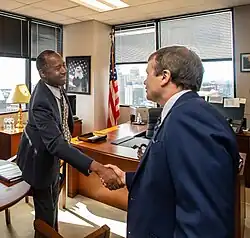 Moore (right) meeting U.S. Secretary of Housing and Urban Development Ben Carson in 2018