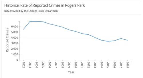 Moore was a pioneer in the effort to bring community policing to Chicago. The Chicago community policing strategy involves residents and other City agencies working together to prevent crime and improve the quality of life in all of Chicago's neighborhoods. Under his leadership, the 49th Ward was selected as one of the first areas of the city to host a community policing pilot project, which resulted in a 54% reduction in serious crime over a 20-year period.[10] Additionally, from January 1, 2013 to February 26, 2013, the 24th Police District, which includes Rogers Park and the adjacent Chicago neighborhood of West Ridge, was the only of Chicago's 22 police districts in which no one was shot.[11] Overall, Chicago Police Department data shows the rate of all reported crimes in the 49th Ward has decreased by 48% between 2003 and 2018, 4% more than the overall decline in crime across the entire city of Chicago during the same period.[12]