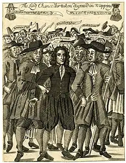 The next day, just a few yards[10] from Gascoyne's shop at Wapping Old Stairs, a vengeful crowd seized Judge Jeffreys, who was trying to flee the country in disguise;[11] Jeffreys was taken into protective custody.